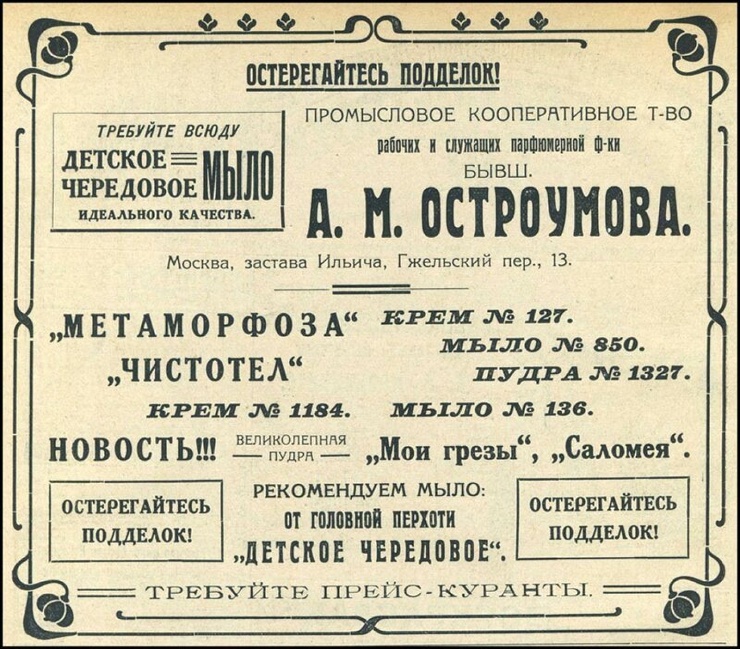 В начале XX века в Российском государстве процветало около тридцати парфюмерных фабрик. После революции, многие предприятия закрылись, и лишь некоторые продолжали функционировать, но были национализированы Советами. Производство духов постепенно прекращалось, а линии переделывали под выпуск гигиенических товаров.