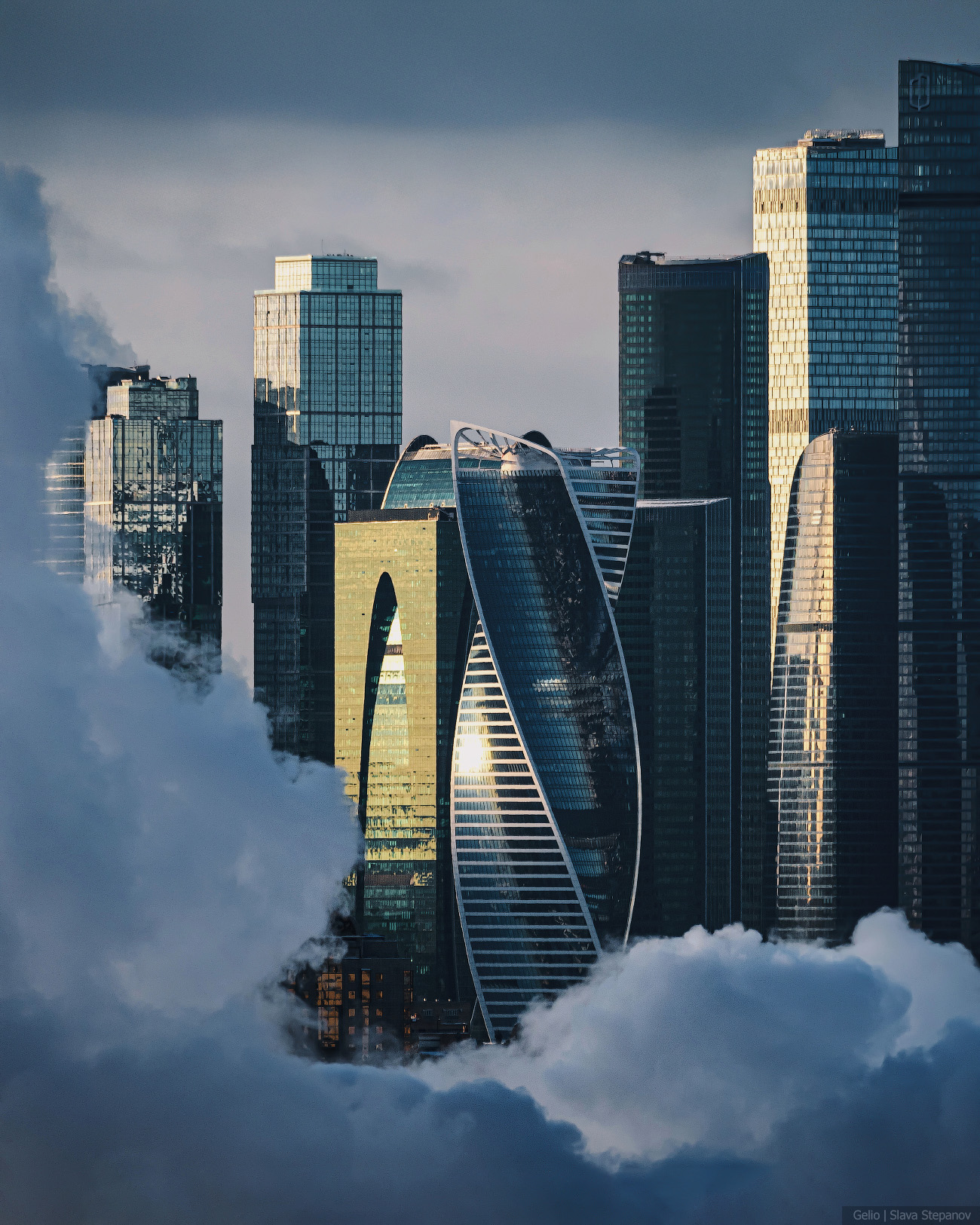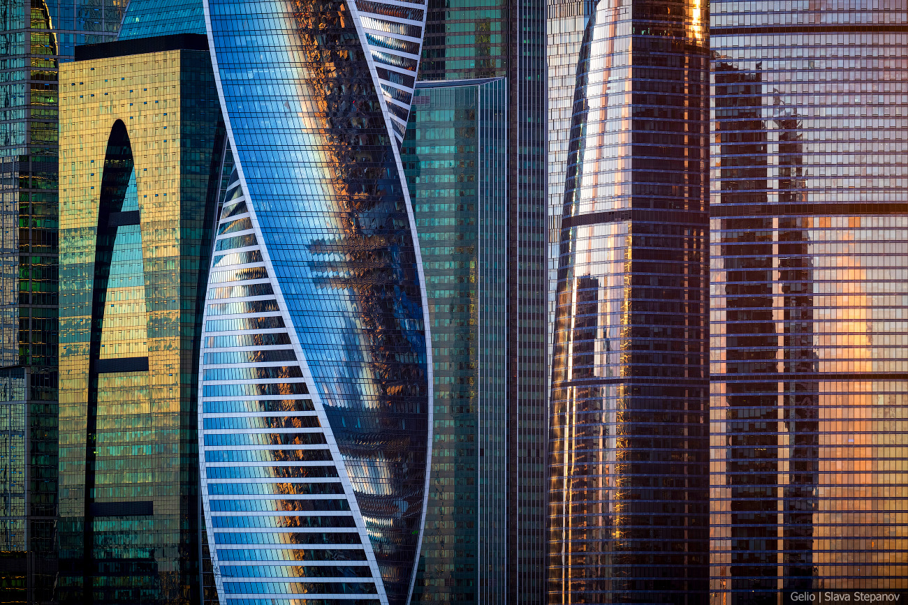 Две ленты противоположных фасадов башни «Эволюция» закручиваются и плавно объединяются металлической конструкцией на кровле. Это напоминает молекулу ДНК и символизирует эволюционную спираль. В здании 55 этажей, общая высота — 246 метров. Небоскрёб расположен в деловом центре «Москва-Сити» и занимает 15 место в списке самых высоких зданий России.