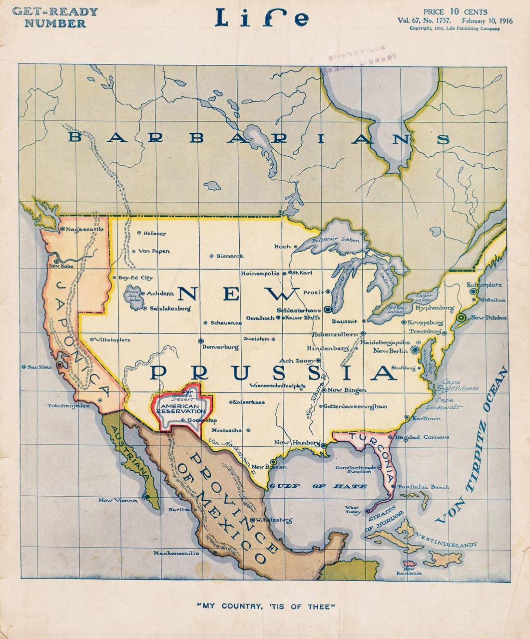Кстати, вот настоящий пропагандистский плакат 1916 года из журнала Life. Граждан США пугают планами кайзеровской Германии по расчленению и германизации страны: