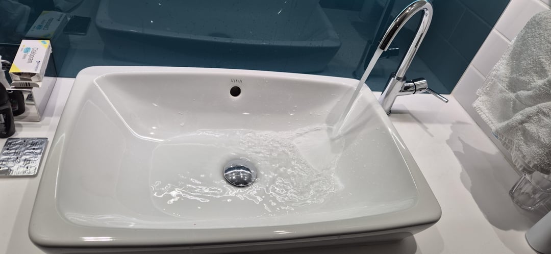 Ну и вот такая огромная раковина с краном в углу. Чтобы помыть руки, не разбрызгивая воду во все стороны, места решительно недостаточно