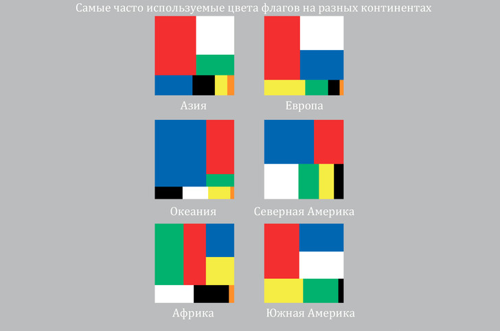 Например, на сайте Flag Stories представлено больше всего трехцветных флагов, а вот шестицветных — всего пять в мире. Самые используемые символы на флагах, если не считать таковыми параллельные полоски, — звезда, полумесяц, крест, солнце и щит. Самые популярные цвета — красный, синий и белый, а также их всевозможные сочетания. И вишенка на торте: в мире минимум 16 стран, чьи флаги похожи друг на друга как братья.