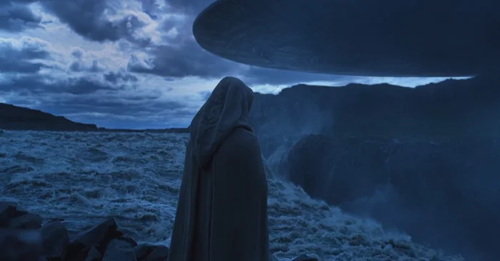 Сцена, происходящая у водопада, задает общий тон всему фильму. Здесь мы видим загадочную фигуру — огромного, молчаливого существа с полупрозрачной кожей и глазами, лишенными белков. Этот необычный персонаж выпивает странную, непонятную жидкость, после чего его тело начинает разрушаться и распадаться на составляющие его молекулы. Именно из этих молекул зарождается новая жизнь, символизируя циклическую природу существования.