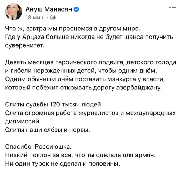 Вообще, конечно, хуцпа отменная, слов нет. Сами признавать не хотят/воевать не хотят — опять русский Ваня кому-то должен. Как года полтора назад говорили одному ютюберу (нормальный безобидный парень Левон Завенович): зачем Пашиняна выбирали? Чтобы он вопрос с Арцхаком порешал наконец? Ну вот он и порешал!
