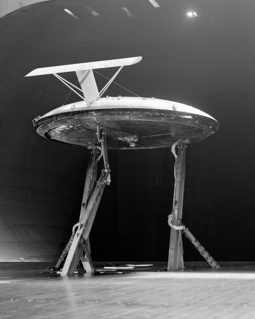 Аппарат Avrocar, установленный на стойках переменной высоты в аэродинамической трубе НАСА, 1961 год