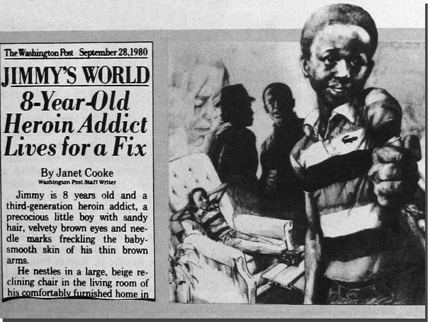 Кук казалась прекрасным журналистом: молодая темнокожая женщина (в 1980-е как раз начали обращать внимание на расовое и гендерное разнообразие среди сотрудников) с отличным резюме, которая несколько месяцев писала для Washington Post небольшие заметки, а потом, видимо, нашла потрясающую фактуру и написала репортаж, разбивший сердце Америке.