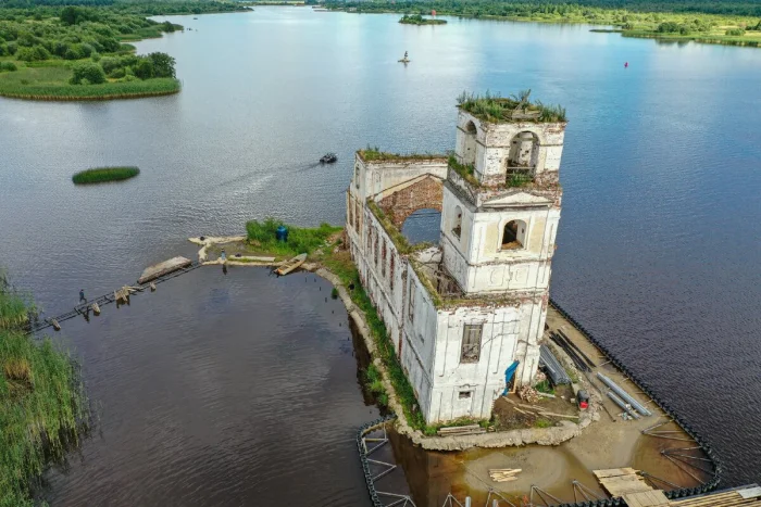 Долгие годы храм стоял посреди озера, пока однажды его судьба не затронула москвичку Анор Тукаеву. Она приехала сюда туристкой — и уехала человеком, решившим сохранить место. Так появился благотворительный фонд «Крохино». Волонтёры вручную очищали завалы, укрепляли фундамент, построили волнозащитную дамбу и даже создали небольшой искусственный остров, который теперь защищает храм от льда и штормов.