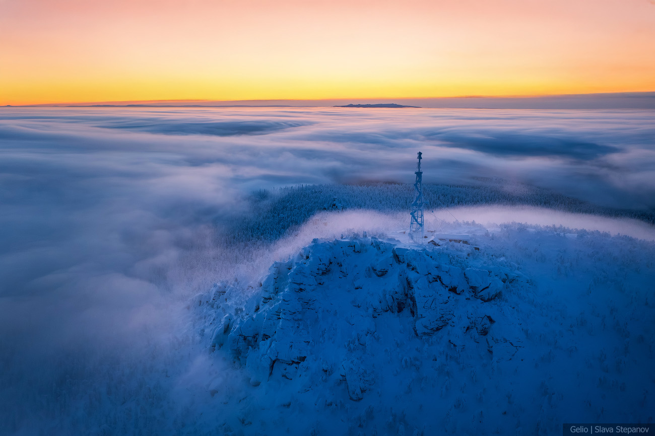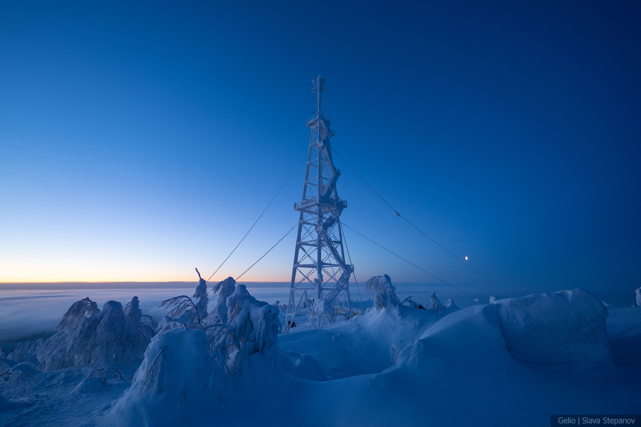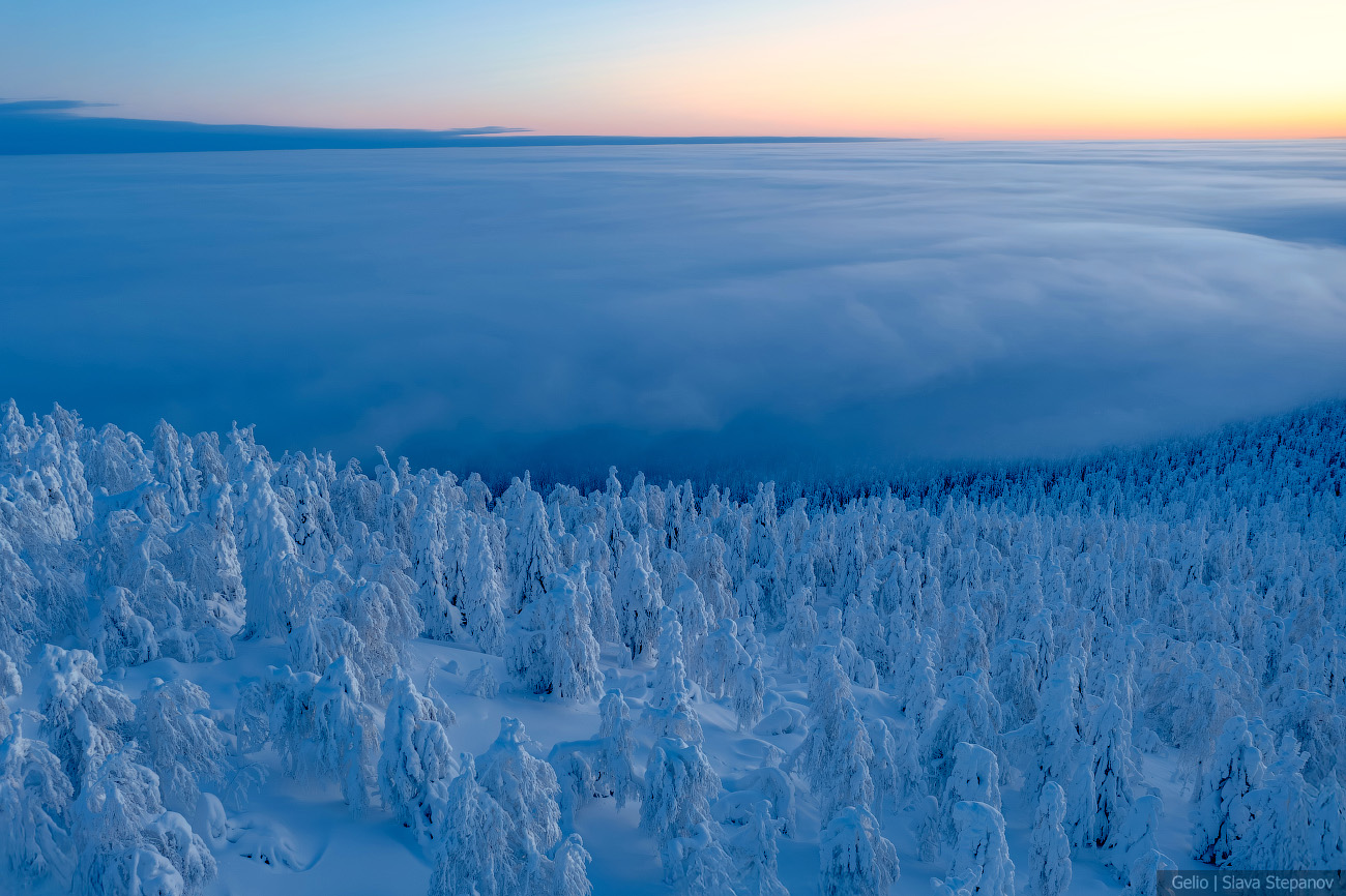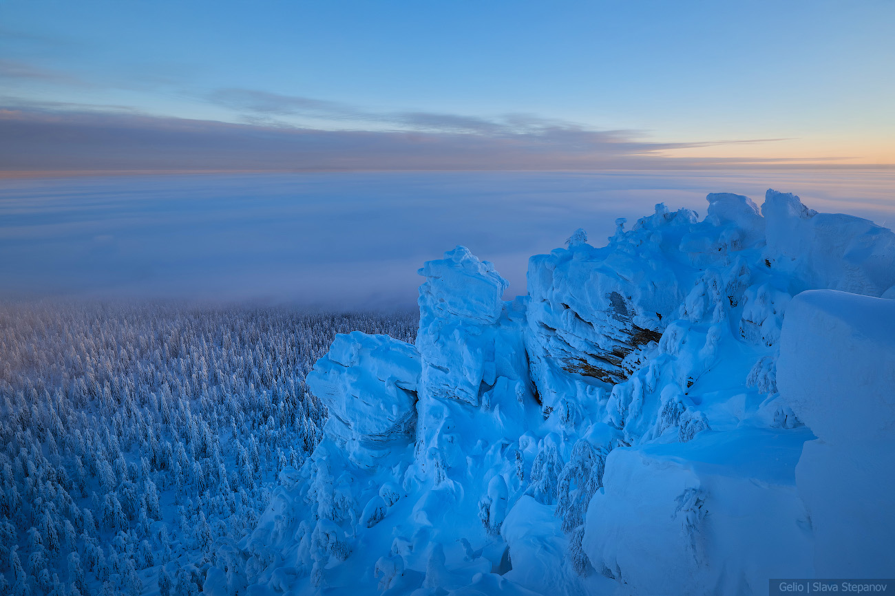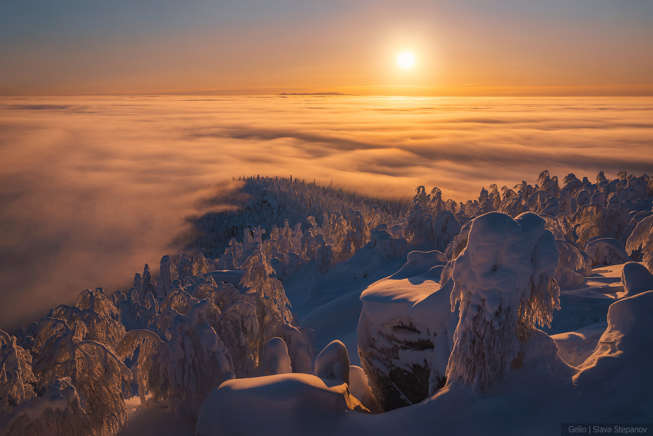 9. Зимний рассвет над Полюд — тайга скрыта под облачным морем, а вершина остаётся островом снега и камня.