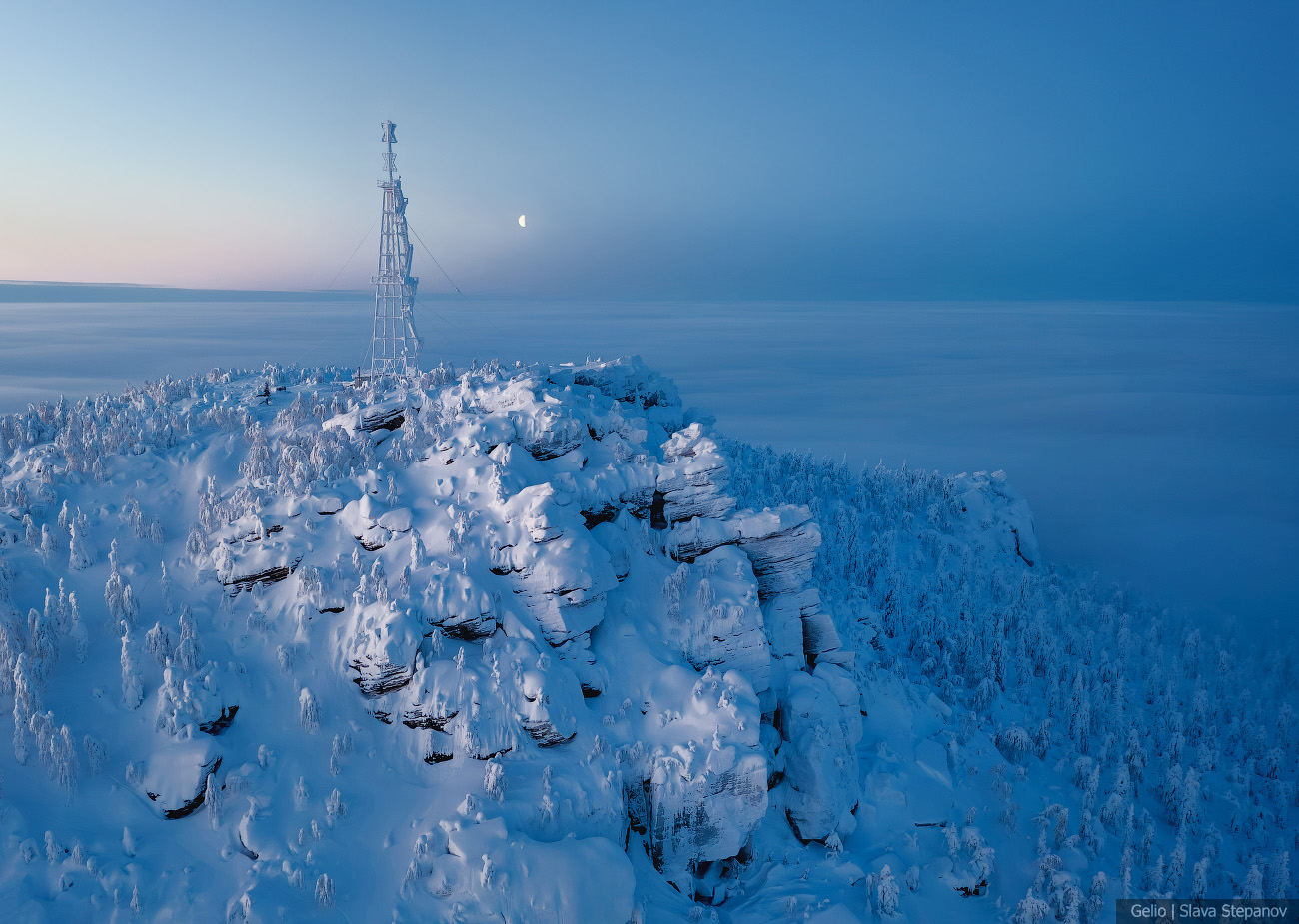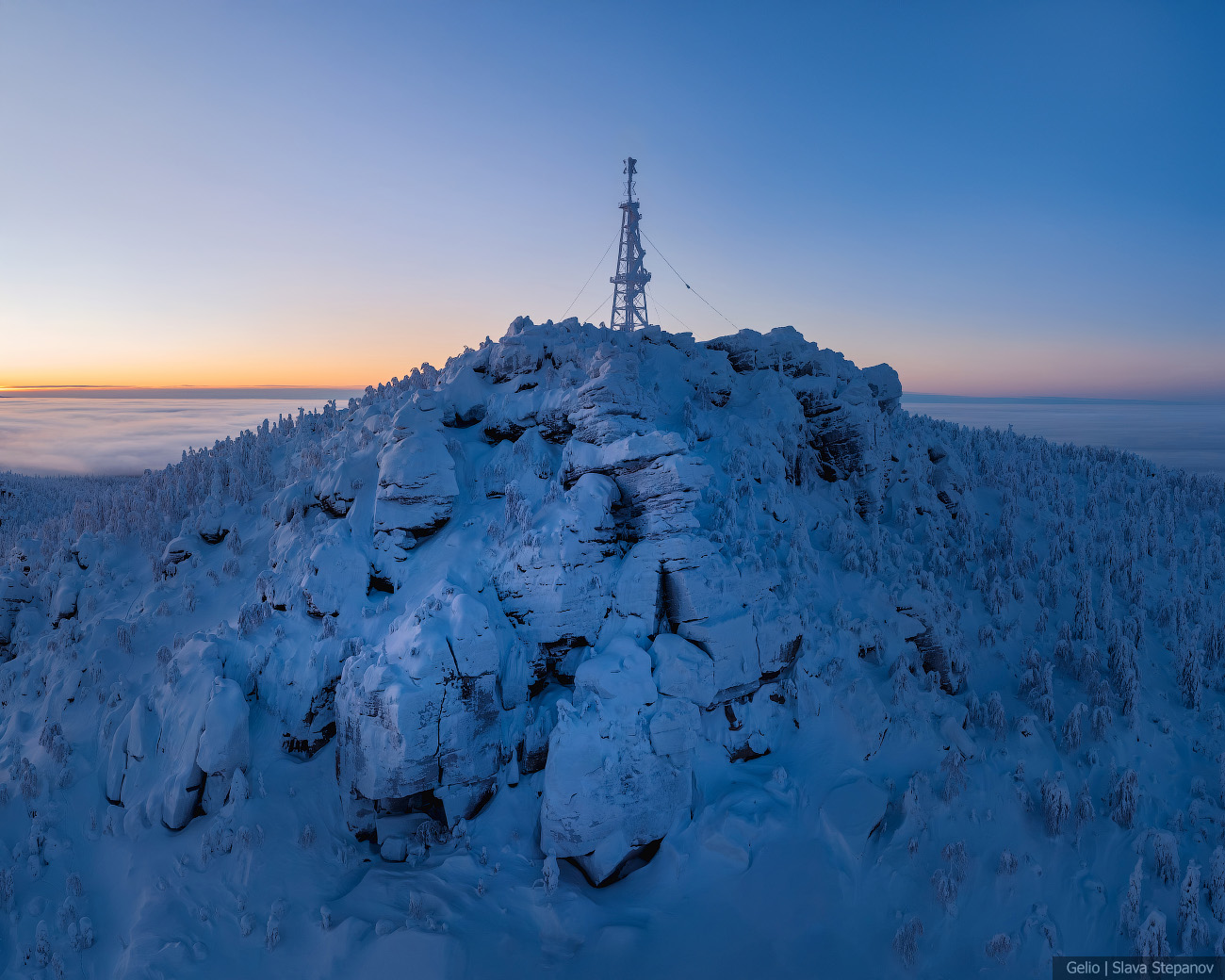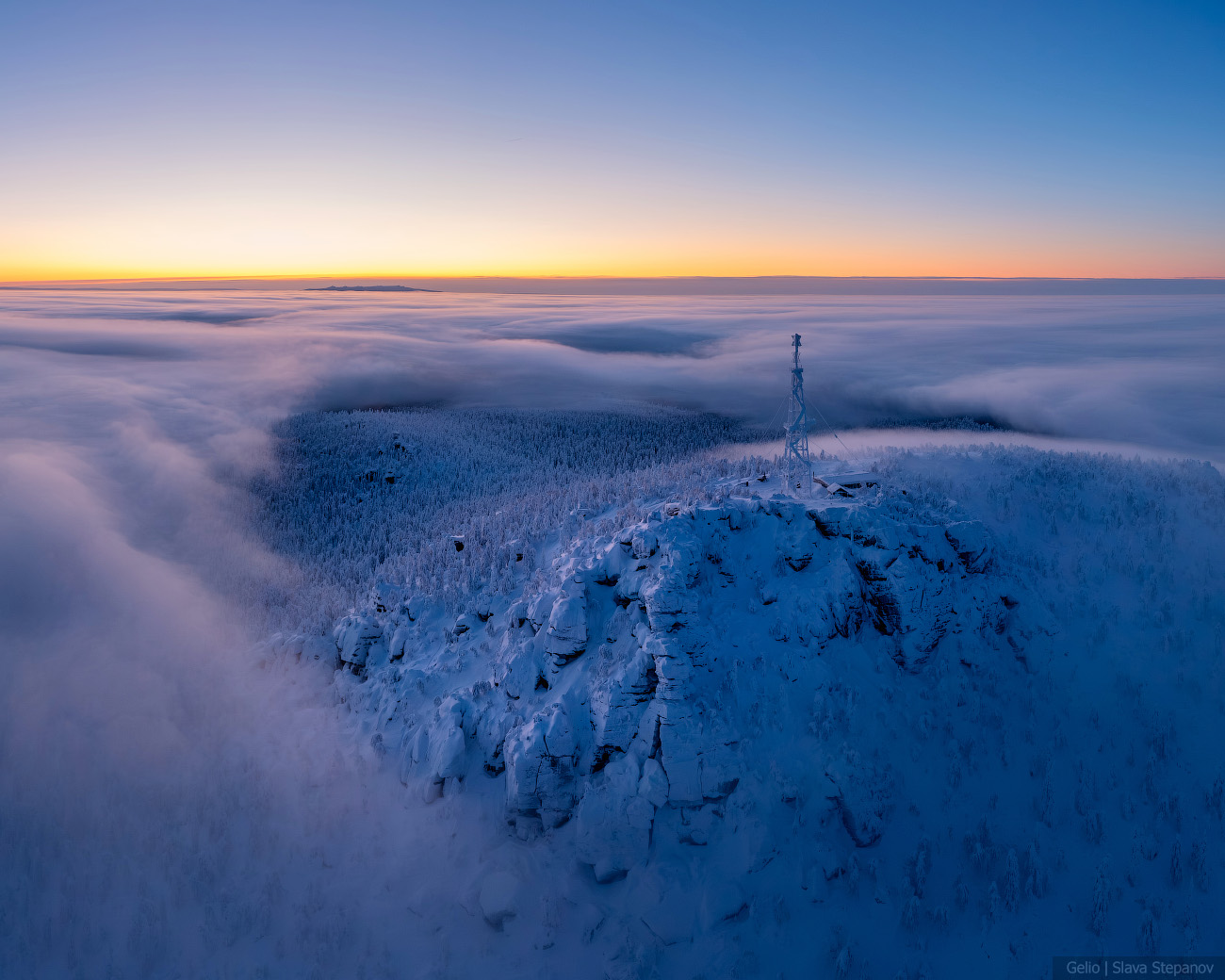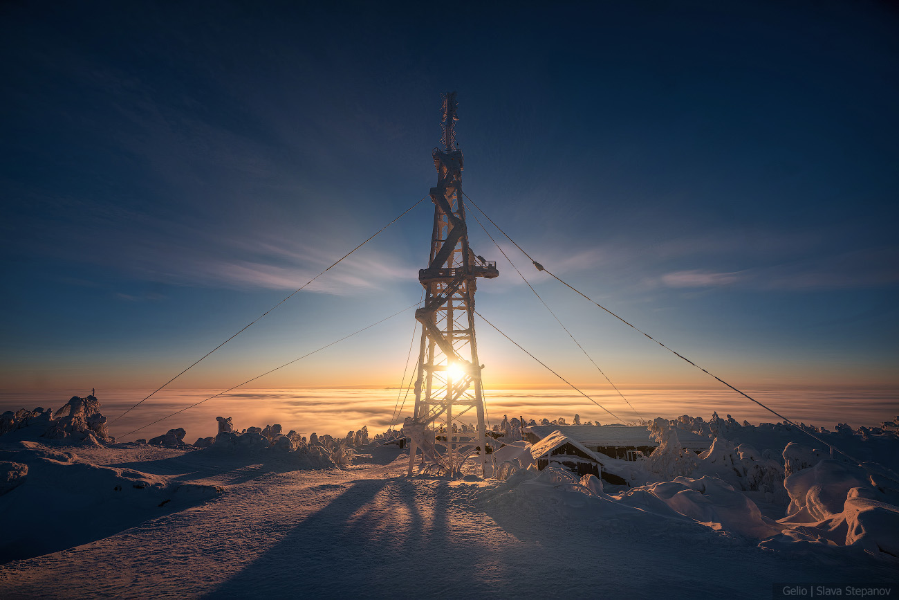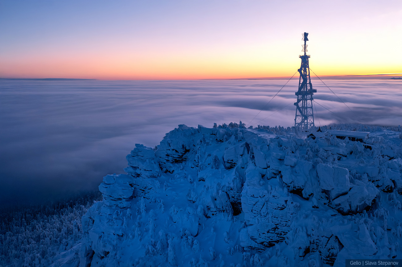 9. Зимний рассвет над Полюд — тайга скрыта под облачным морем, а вершина остаётся островом снега и камня.