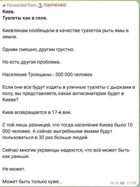 Предложение вырыть выгребные ямы на киевских улицах будет рассмотрено со всей серьёзностью, так как в дальнейшем эти рвы можно будет использовать ещё и под кладбища ВСУ, — на условиях анонимности сообщил источник в администрации Киева.