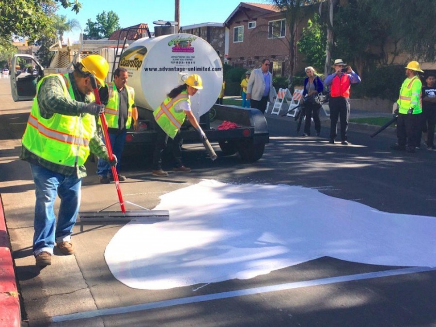 PS. Если вы захотите рассказать нам, что это делается якобы для снижения температуры асфальта под солнцем — спасибо, я знаю. Эта краска снижает температуру асфальта на широте Лос-Анжелеса в летний полдень примерно на 5 градусов Цельсия. Вполне очевидно, что это малосущественно и не стоит подобной суеты. В Неваде, где дороги реально страдают от перегрева — эту задачу решают проще — путем добавления в асфальт крошки белого камня, в результате дорога через небольшое время, после того, как шины стирают верхний слой битума, выглядит вот так: