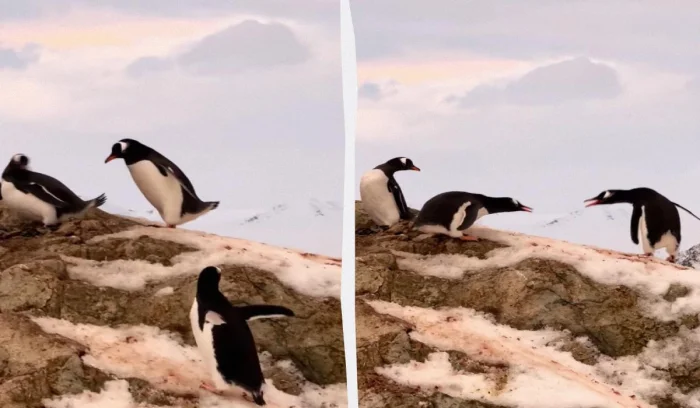 На антарктических островах хорошие камни — на вес золота. Большинство из них острые, неудобные или слишком мелкие, а вот гладкие и округлые подходят для строительства гнезда идеально. Именно поэтому за один удачно найденный камушек может разгореться настоящая драка. Если два самца заметили один и тот же «идеальный» экземпляр — столкновения не избежать. Крики, толчки, удары клювами — всё как в лучших гладиаторских боях, только на льду.
