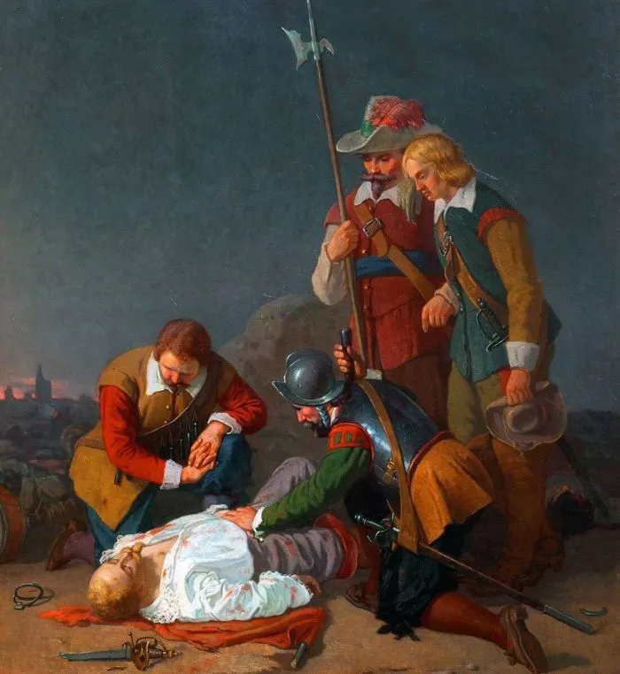 Существует несколько версий гибели шведского короля Густава II Адольфа. Кто-то утверждал, что король по причине близорукости оказался слишком близко к позициям противника (решил самолично провести рекогносцировку) и схлопотал пулю. Но чаще звучит версия, что король сам возглавил кавалерийскую атаку, во время которой получил пулю в руку (эта же пуля ранила и лошадь короля). Король приказал продолжать атаку без него, а сам отстал с небольшой свитой в десяток человек.