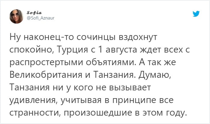 Для всех тех, кто не может жить без путешествий и изголодался по другим странам, есть хорошая новость! С 1 августа Россия открывает международное авиасообщение. Но не всё так радужно: пока только с тремя странами. Это Великобритания, Турция и Танзания. Сейчас мы покажем, как на эту новость отреагировали соцсети (в шутках и мемах, разумеется). Спойлер: больше всего вопросов вызвала Танзания.