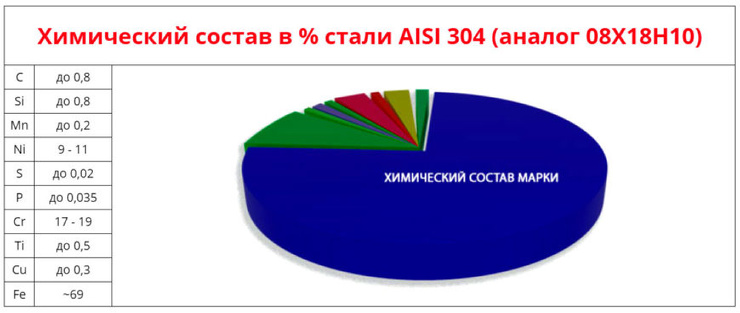 AISI 304 содержит небольшое количество углерода – 0,08% максимум, а масса хрома в ней составляет 18-20%. Сталь используется для производства различного оборудования (для пищевых, химических предприятий), систем вентиляции, дымоходов, кухонных принадлежностей, хранения и транспортировки напитков и др.
