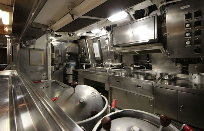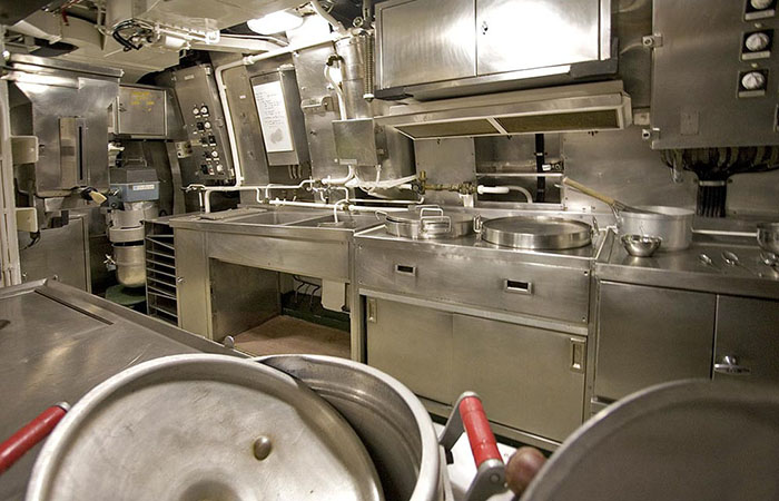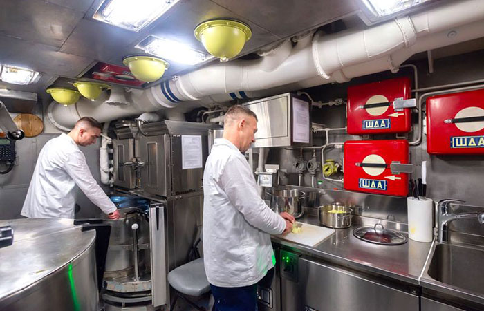 На подводном корабле всё устроено так, чтобы в ограниченное пространство с максимальной пользой и хоть каким-то комфортом для экипажа вместить множество вещей. Камбузу здесь тоже нашлось место. Он занимает всего несколько квадратных метров, но в нём уместилось всё необходимое: плиты, духовые шкафы, холодильные камеры, морозильники, тестомесы и на некоторых атомоходах даже небольшая машина для приготовления мороженого.