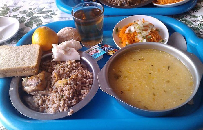 Завтраки были сытными: каши с маслом, яйца в разных видах, мясные или рыбные блюда. Обеды включали первое и второе, а ужины нередко дополняли сладким чаем и выпечкой. Питание строилось на строгом распорядке: три основных приёма пищи и дополнительное «полдниковое» время, когда дежурный камбуза мог выдать бутерброды или горячий напиток.