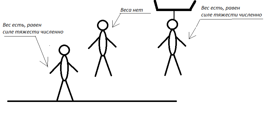 Вес — это сила с которой тело ДАВИТ НА ОПОРУ/ПОДВЕС (зависит от среды в которой находится, прочих сил, характера движения тел, например центростремительное движение в центрифуге или при вираже самолета увеличивают вес тела — например для человека смертельной считается перегрузка 9-11g (т.е. вес увеличивается в 9-11 раз)