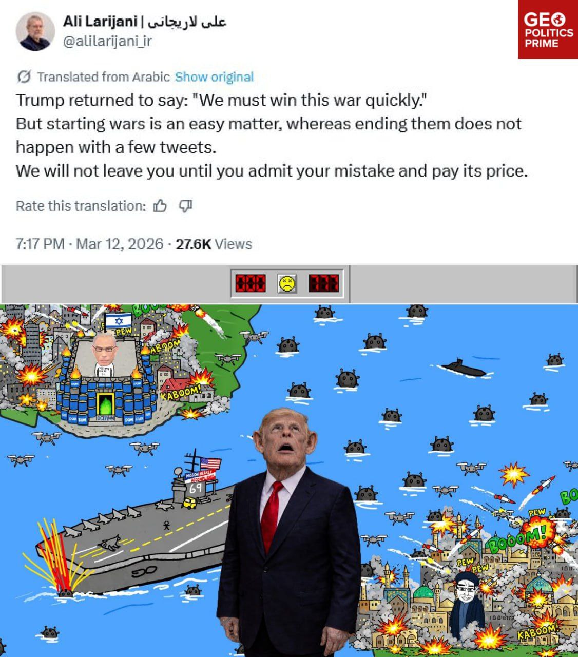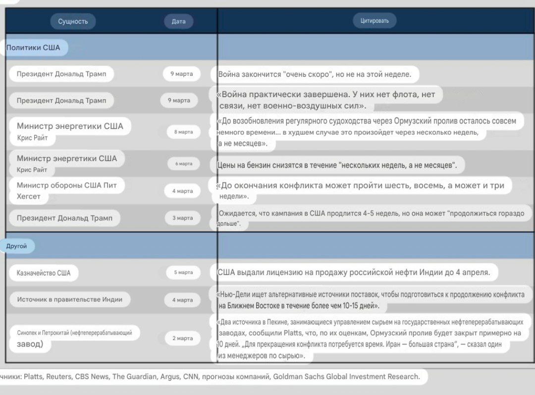 Американские банкстеры Goldman Sachs выпустили издевательский отчёт с собранием заявлений Трампа и его администрации об окончании войны с Ираном. Заявления варьируются от «скоро» и «почти завершена» до 8 недель и туманного «продлится гораздо дольше». На днях прозвучало и пространное «столько – сколько потребуется»