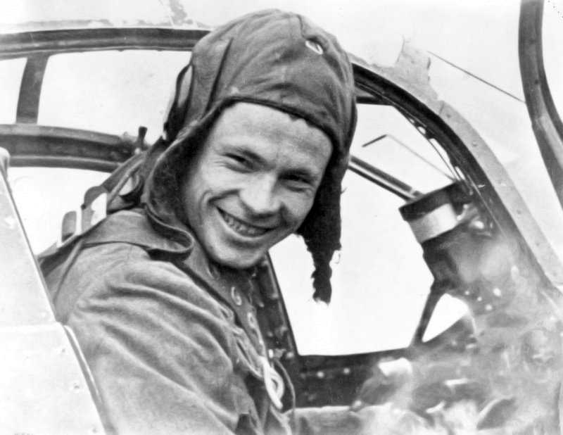 Майор Павел Степанович Кутахов (будущий дважды Герой Советского Союза и Главный маршал авиации) в кабине истребителя американского производства P-39 «Аэрокобра». Карельский фронт. За годы Великой Отечественной войны П. С. Кутахов совершил 367 боевых вылетов, провел 79 воздушных боев, сбил 14 самолетов противника лично и 28 в группе